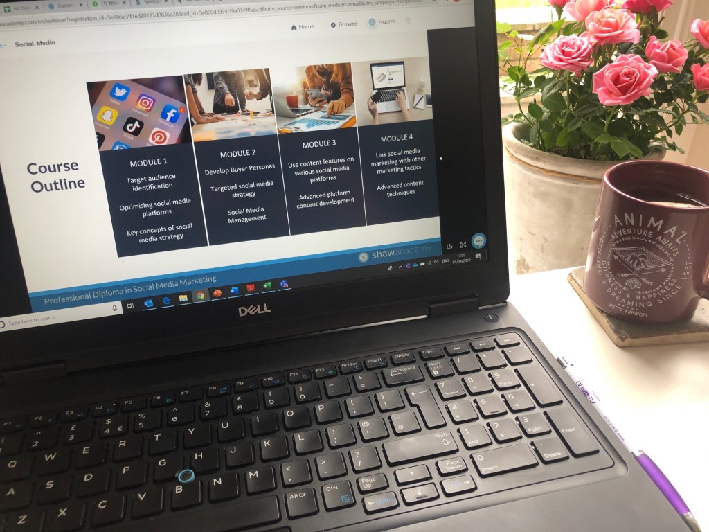I came across a ‘free’ social media marketing course which I thought would help with my development & keep me focused whilst i’m in Furlough & not working… it is interesting & I’ve done my module 1 (8 classes), ready to continue the next 3 modules but have since found out that I’ve had to extend my free period in order to be able to complete the modules in the time frame..(very sneaky!) so now I’ve signed up for a year which was the most cost-effective option – at least it gives me access to lots of other courses – there’s one on social media content & blogging that might be useful for me!